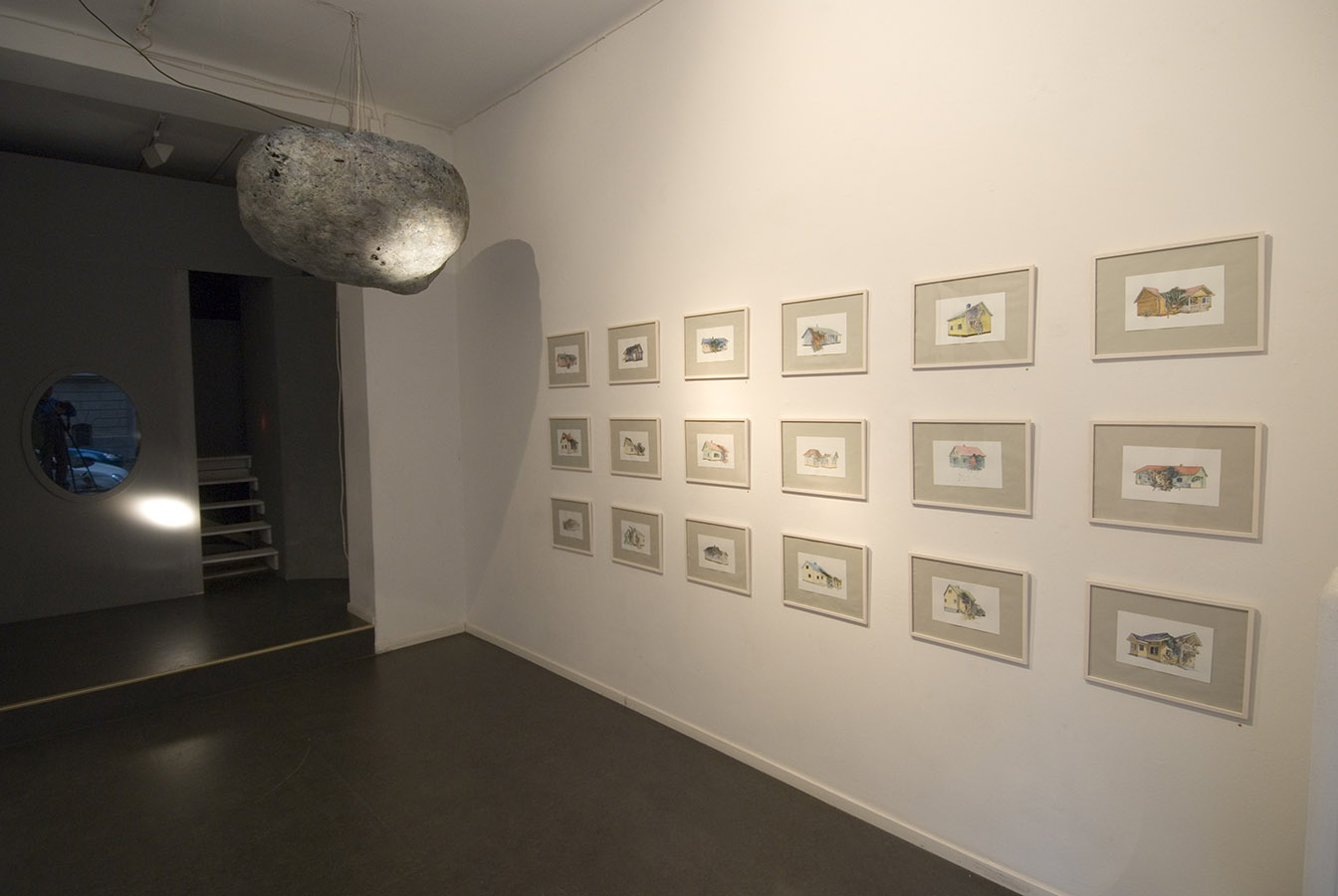 Construction with surveillance system, fake rock, watercolour paintings ("Targets"). There is a small house built in the upper corner of the gallery space. Stairs lead to the room so that the viewer can go inside the space. There is a small surveillance monitor with changing camera angles. As the viewer examines the footage it becomes apparent that it is coming from the very same gallery space.